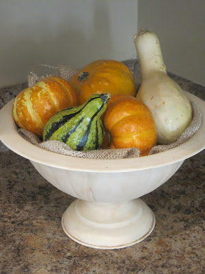 I bought a bag of fall produce that I thought I would use for either the mantle or the table. After deciding I didn't like it in either of those places, I added some burlap to the bottom of our fruit basket in the kitchen & arranged the pumpkins & squash on top. This turned out to be the perfect place for them!