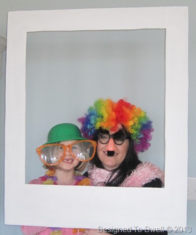 After lunch, we played around with the photo booth a little bit. To make the polaroid looking frame, I cut out a piece of cardboard to the shape & painted it white. Then we hung it from the ceiling using thumb tacks & fishing wire. I grabbed a basket & tossed in all the props I could find around the house.